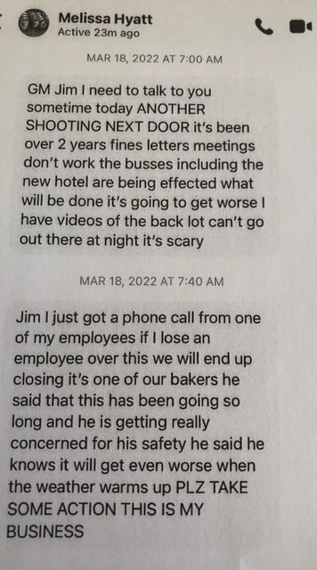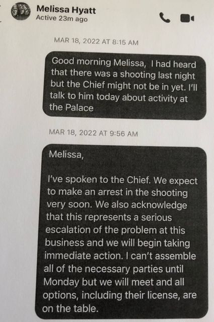 147. In her next text, she goes on about the possibility of losing her employee because he is concerned for his safety. Did you think about our employees who had to go through this ordeal. None of them quit. It’s because they knew this was a one off. They were familiar with the two bad guys. They also knew that the Palace was no worse than all the other busy places in town (more on this on a later blog). They knew that the Palace was not what you have been making it out to be.