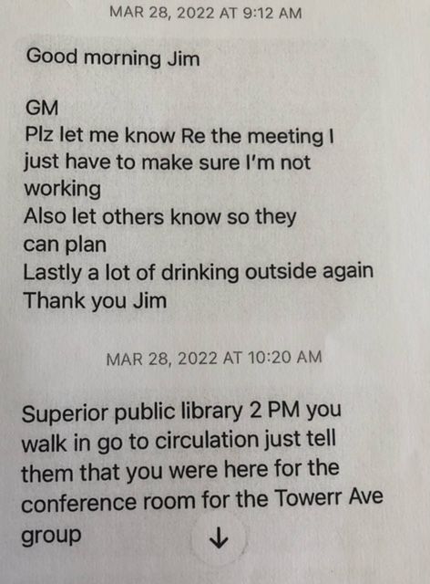 One of the pieces of information you sent me has a text from Melissa Hyatt to the Mayor dated on March 28. 2022 about a meeting at the library on March 29, 2022. The meeting had to do with the Palace Bar. Is there any info. on this meeting? Minutes? Who was there? What did they talk about etc? Why was the meeting at the library instead of City Hall?