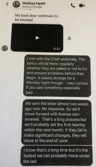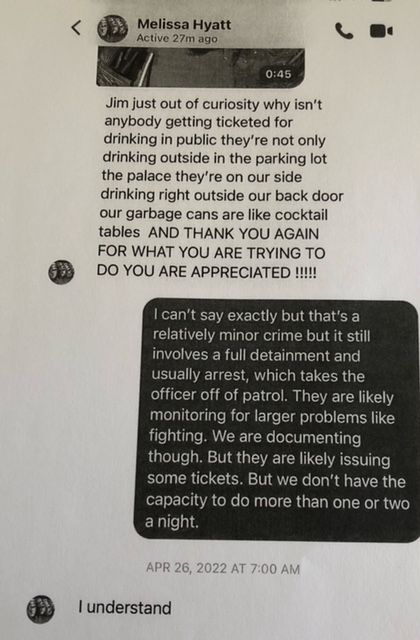 220. So, first off, the incident that she is referring to was between two women who were arguing, and then at some point one struck the other. Why they sent five police officers over, I don’t know. But none the less, she wants to close us down (for, what feels like, the 50th time) for that. And then the Mayor chimes in his infinite wisdom, and suggests that they start billing us. I then reached out to the Chief to ask him about billing. (see below)
