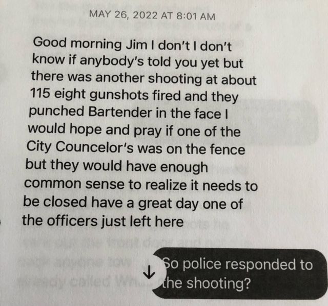 219. Melissa sends a text to the Mayor(see below). She goes on to say that they punched the bartender in the face. No, the bartender was untouched. The bouncer was the one assaulted. Todd Peterson, the shooter, became an unruly customer. He was not a regular, nobody knew him. When he began causing disturbances in the bar, he was asked by the bouncer to leave. He left in the direction of the Cobblestone Hotel where he was staying. Patrons in the back of the Palace heard gun shots coming from the alley next to the hotel. It would be like somebody shooting a gun in the Dollar Store parking lot on Tower and then saying it happened at Walmart. Close enough I guess. Then she goes on yakking about closing us down. IT DID NOT HAPPEN ON PALACE BAR PROPERTY.