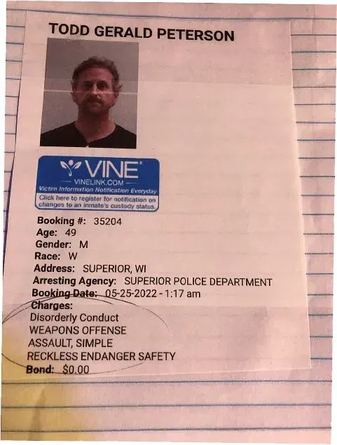 Officers arrived in the area and located a male matching the description of the suspect in the parking lot of 1102 Tower Ave; Cobblestone Hotel. The male was identified as 49 year old Blaine, MN resident Todd Gerald Peterson. Peterson was taken into custody.