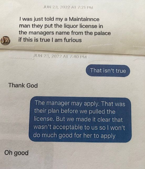 As far as “Tony” goes, he was an employee at the Palace when I bought it. I kept some of the staff and he was one of them. He was a bartender and very experienced at fixing things around the bar. In the final year or two that the Palace was opened he wanted to cut back on his hours and worked Saturday and Sunday day shifts and also filled in when needed. He also continued doing handyman work. He or any other employees weren’t part of any discussions or stipulations in the sale of the Palace to Jordan. If she had bought it then it would have been up to her to make staff decisions. Melissa then goes on, with no explanation whatsoever to say that “on some level he was part of the problem”.